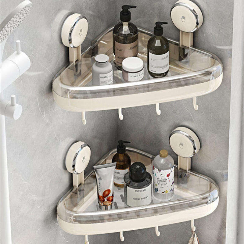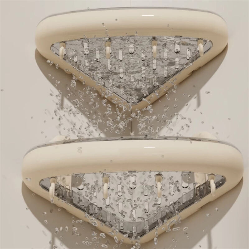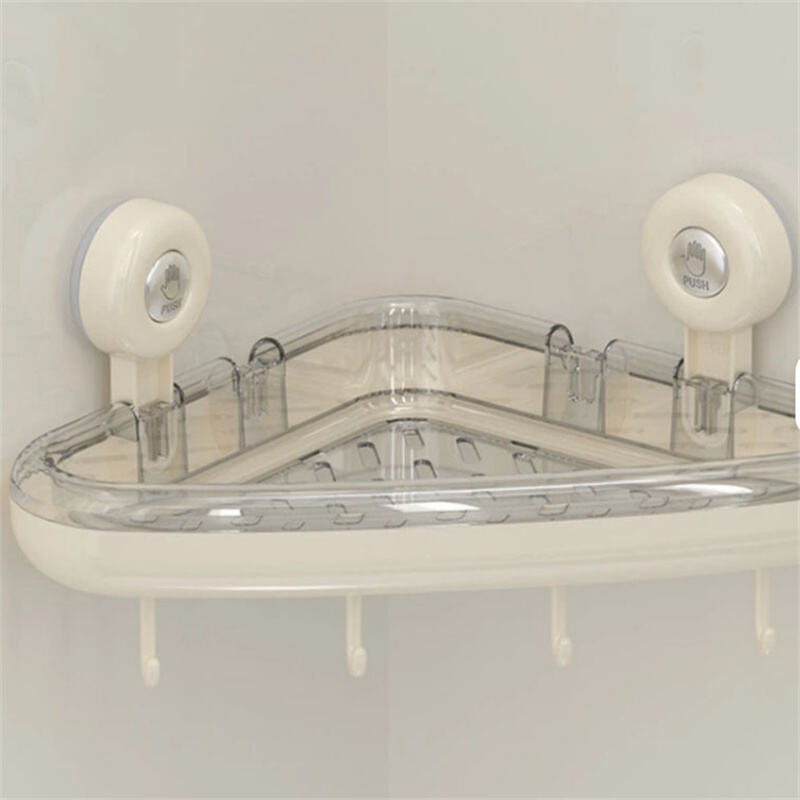 Denna uppsugningshållare har en triangulär design som anpassar sig tätt till väggens hörn och integreras med hörnutrymmet, vilket gör att hörnutrymmet utnyttjas fullt ut för förvaring och ordning. Uppsugningshållaren är gjord av ABS-material, vilket är rostfritt och har en slät yta. Den är vakuumkomprimerad och har hög bärförmåga, kapabel att bära upp till 15 kg. Den ihåliga designen filtrerar effektivt vattenfläckar och håller förvaringshållaren torr. I botten finns en krokdesign, som kan användas för att hänga handdukar och andra föremål, och är multifunktionell.